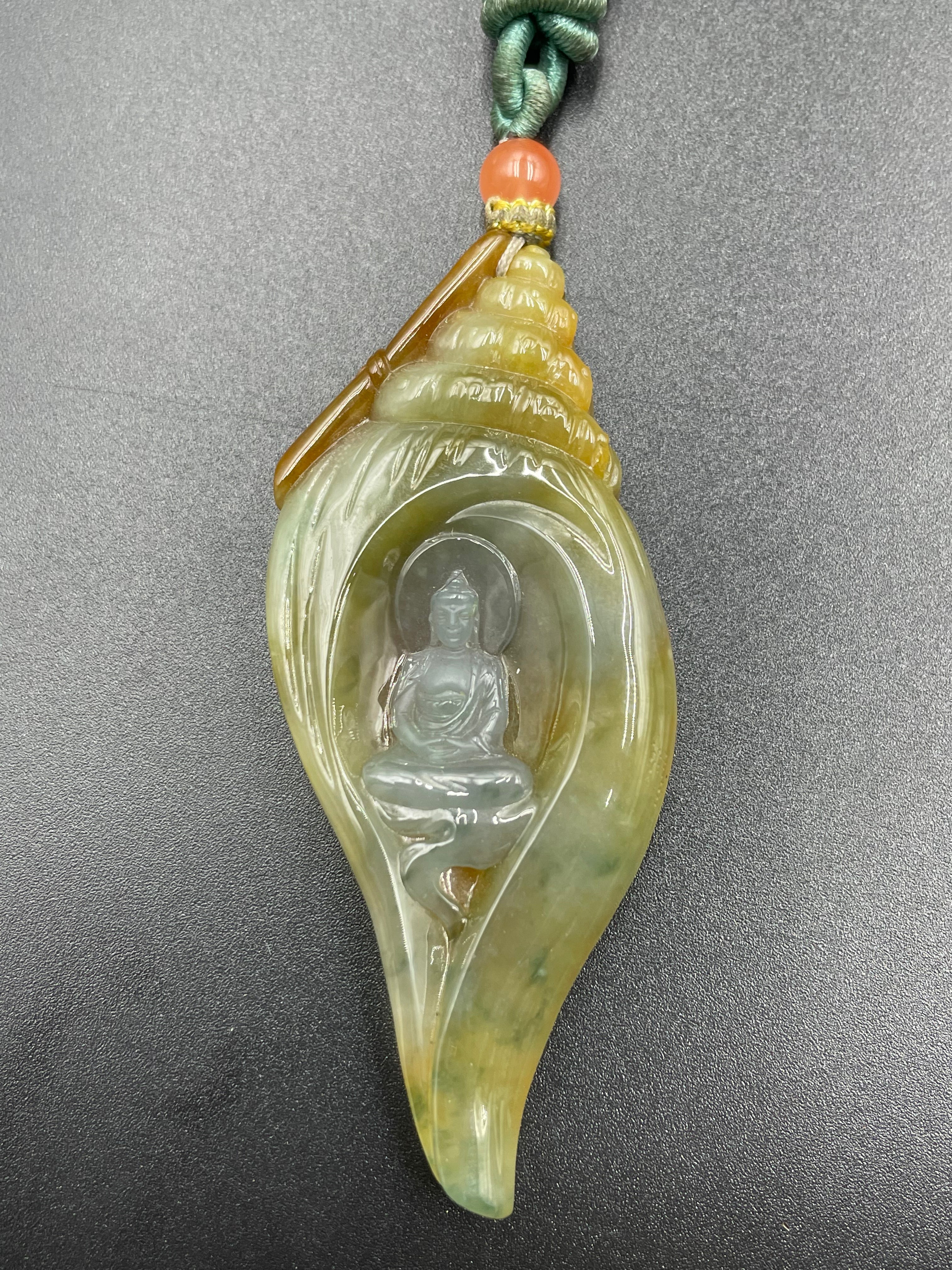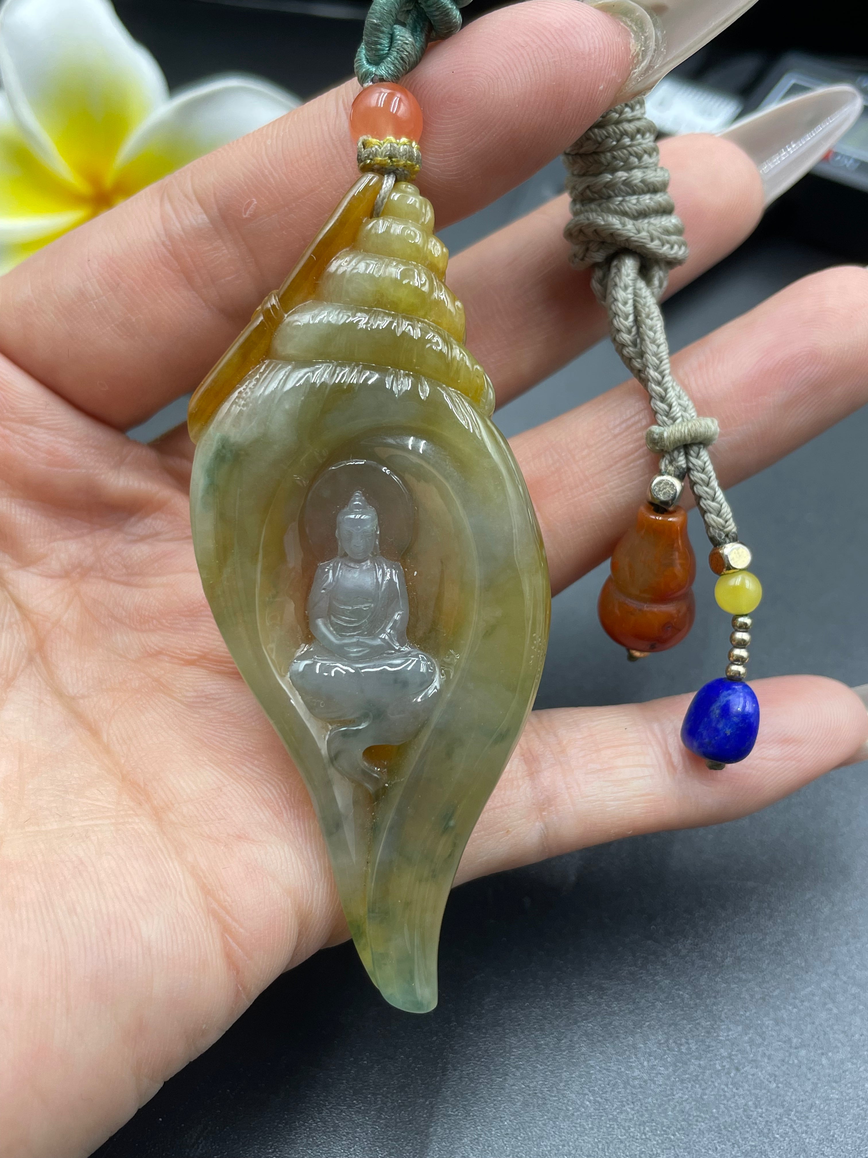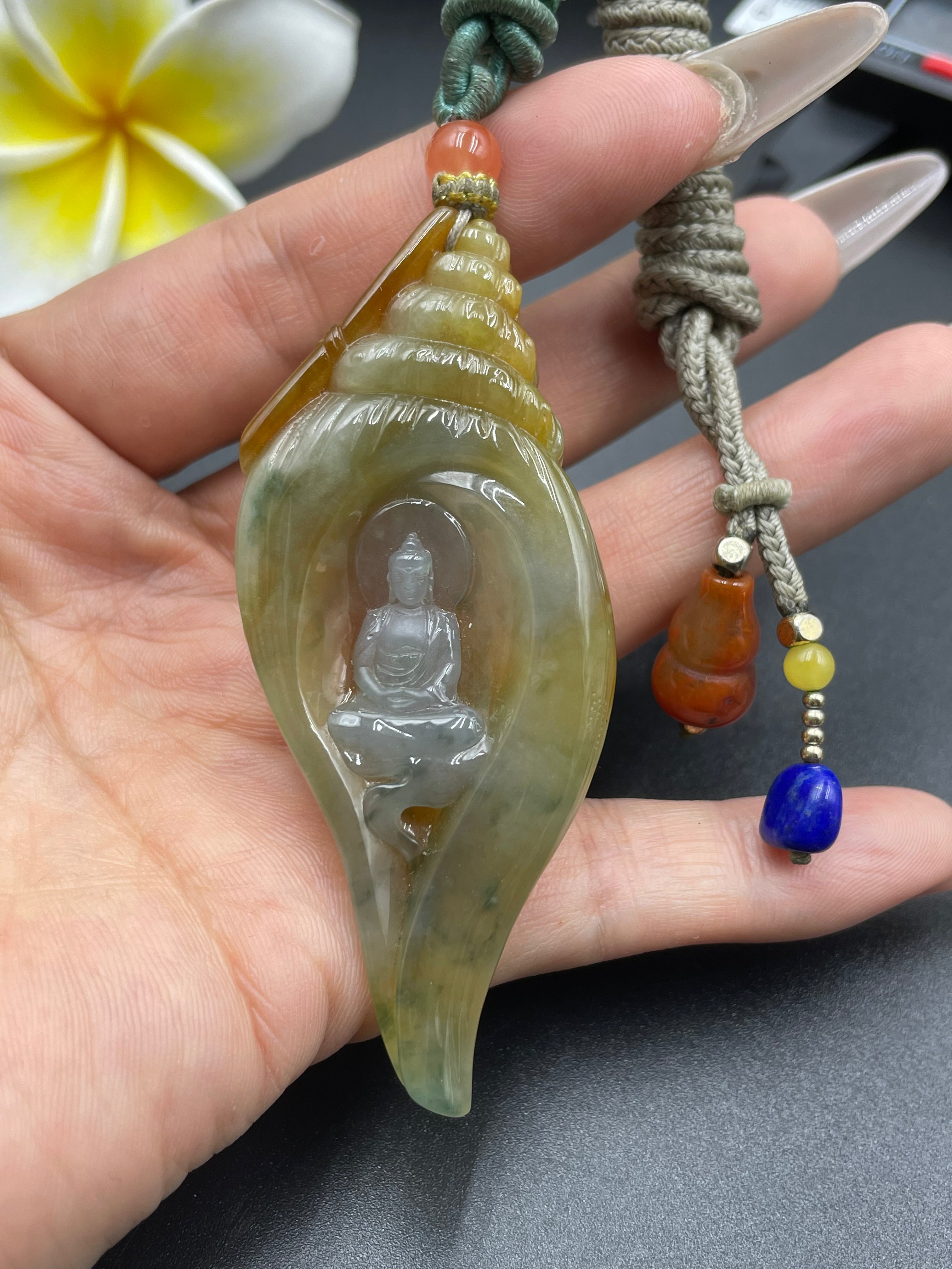能所涉黑暗,带来希望和指引。在翡翠挂件中,法螺与大日如来相结合,进一步增强佛法的力量和影响,寓意着佩戴者能够受到佛法的庇护,远离邪与凶,走上觉悟和解脱的道路。