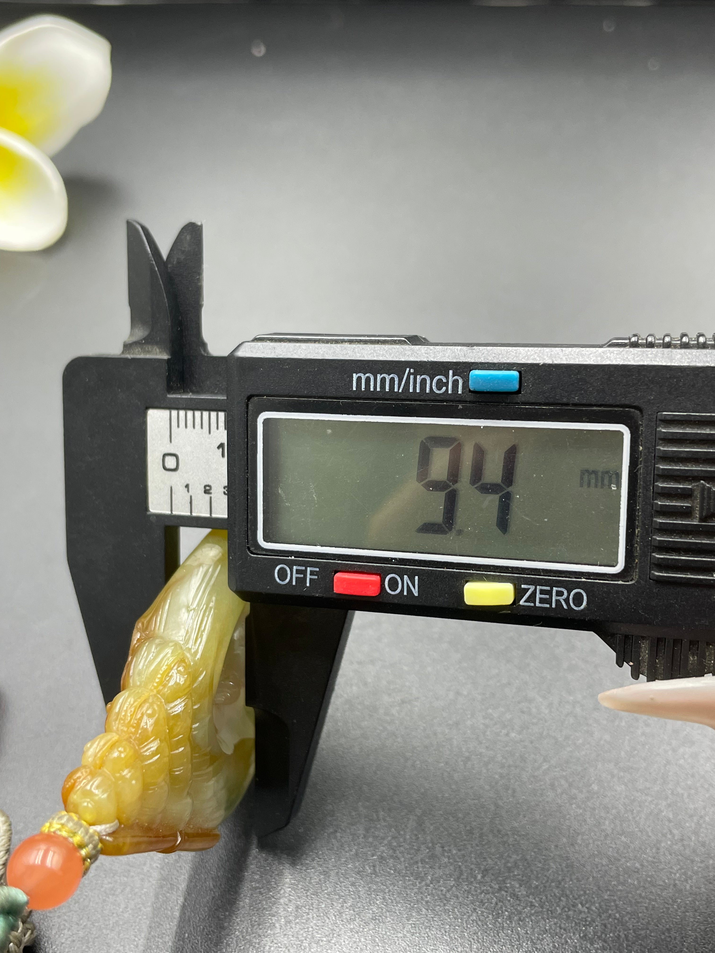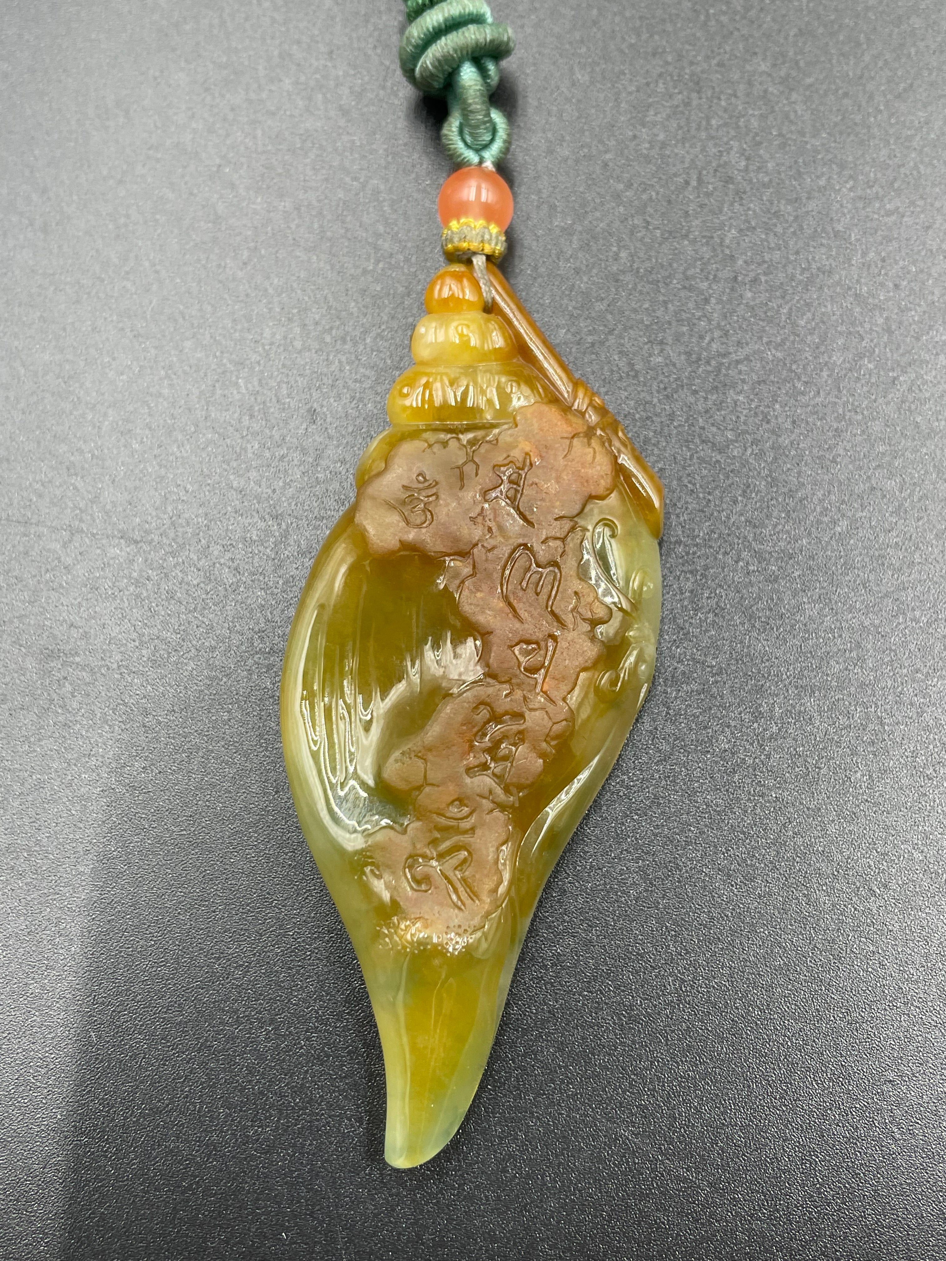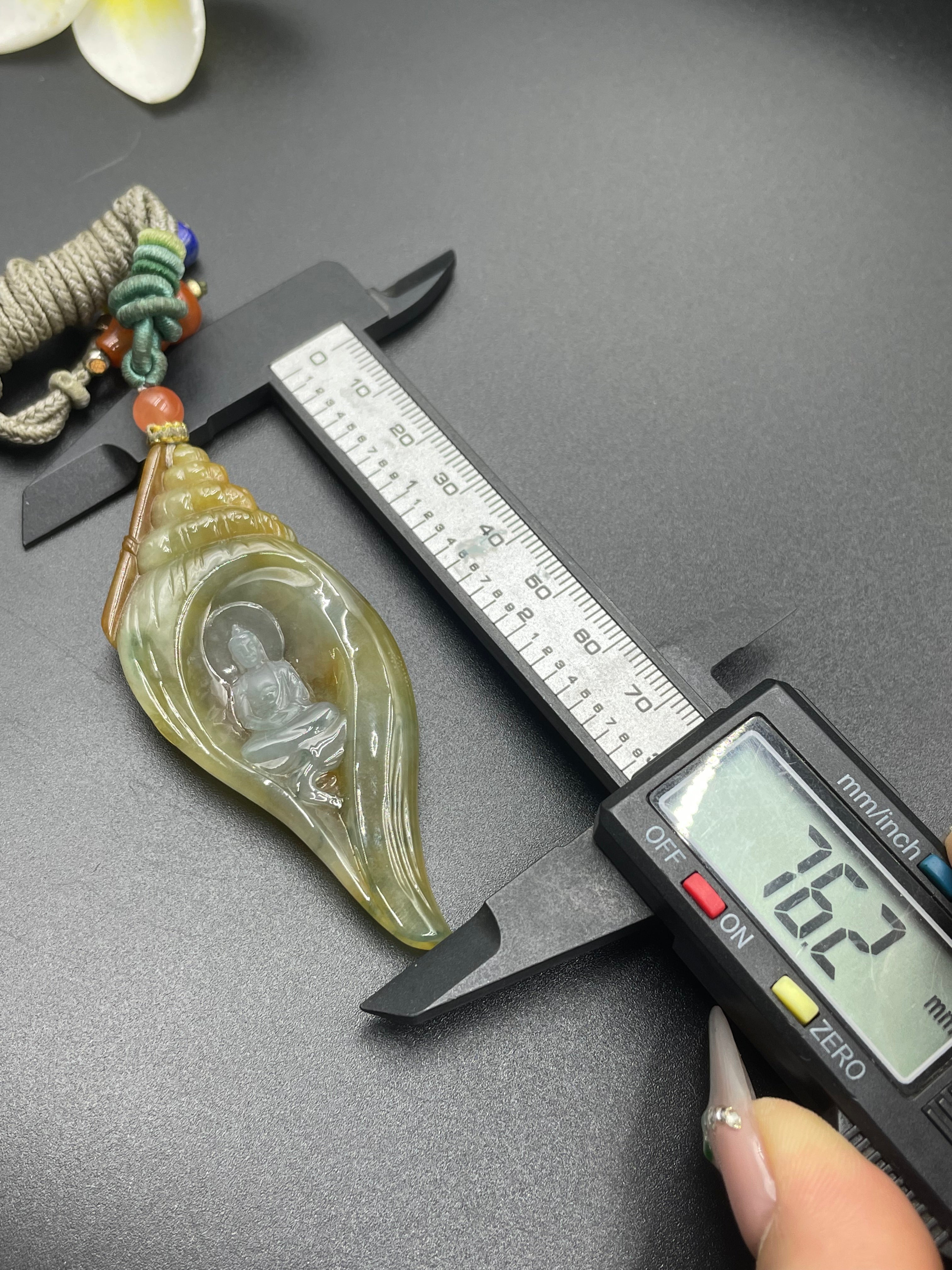 能所涉黑暗,带来希望和指引。在翡翠挂件中,法螺与大日如来相结合,进一步增强佛法的力量和影响,寓意着佩戴者能够受到佛法的庇护,远离邪与凶,走上觉悟和解脱的道路。