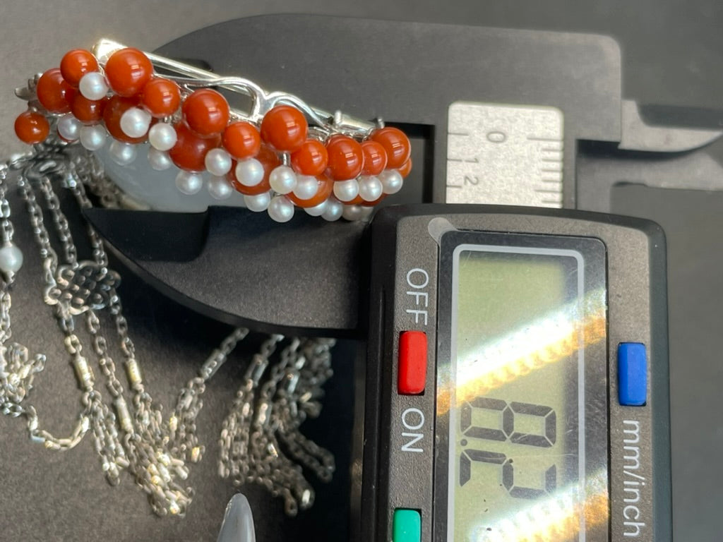 造型设计:整体造型模仿了戏曲中的凤冠,尤其是上方由南紅和珍珠组成的部分,宛如凤冠上的珠翠装饰,而两侧的银色部件形似凤冠上的凤鸟等造型 。