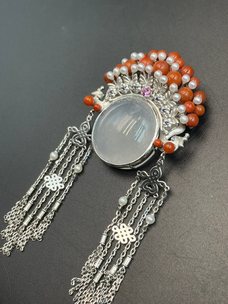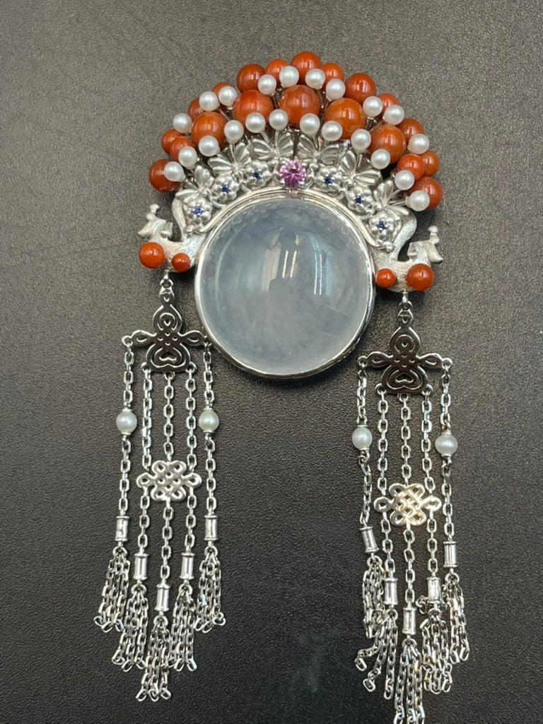 緬甸天然翡翠 冰種蛋面戲曲鳳冠流蘇吊墜 個性時尚潮流設計 緬甸天然翡翠 冰種蛋面戲曲鳳冠流蘇吊墜 個性時尚潮流設計