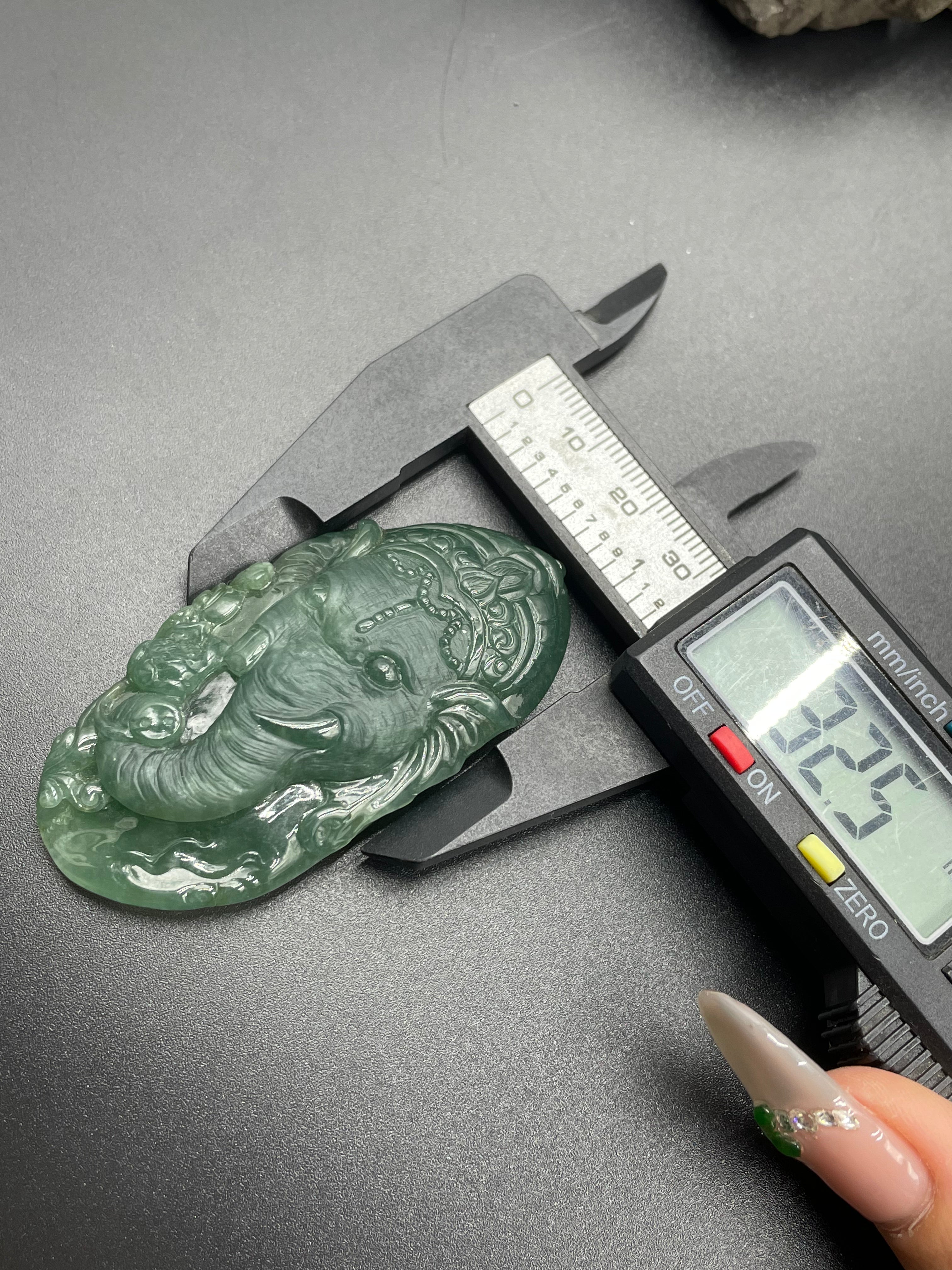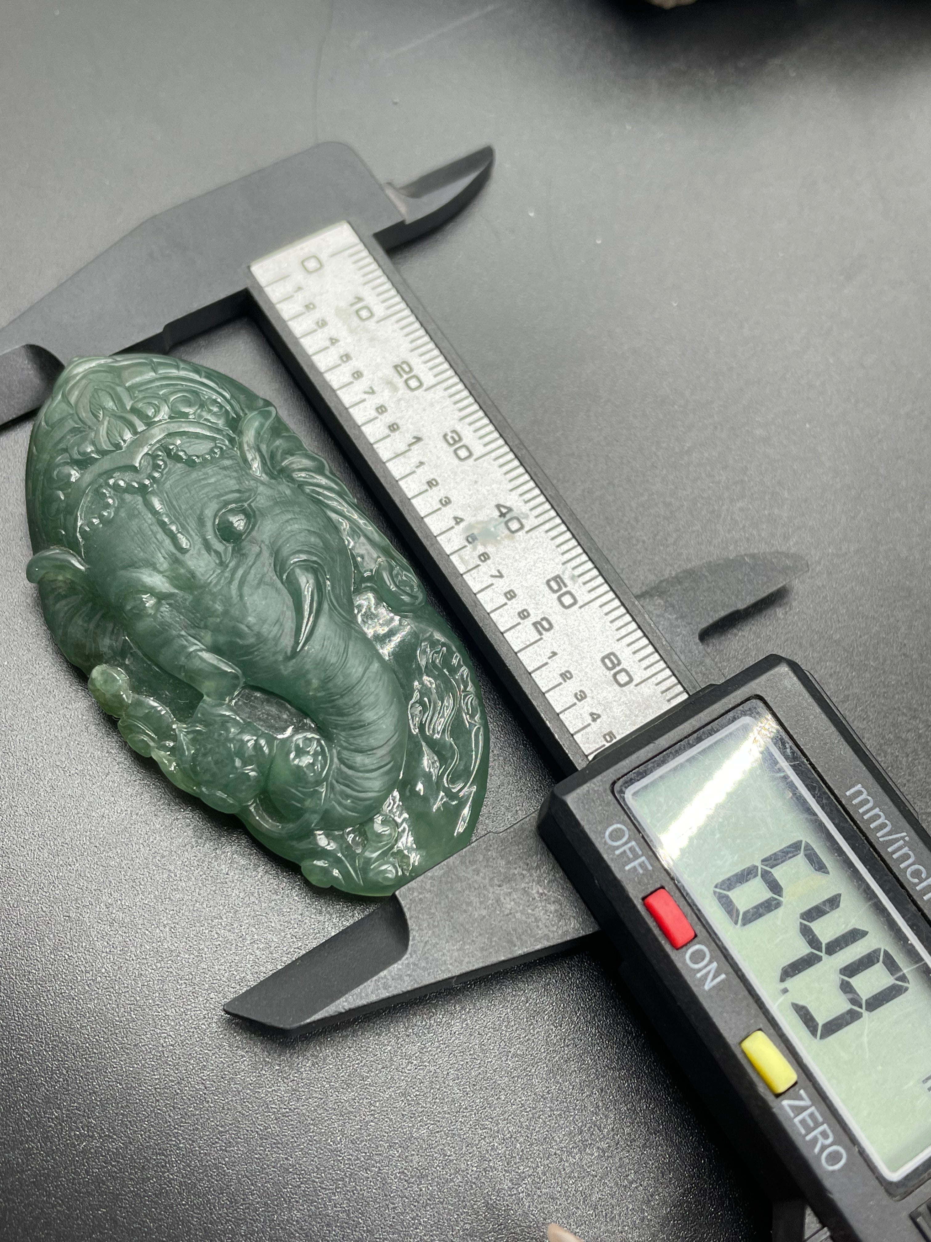 工藝上,運用浮雕、圓雕、陰刻等多種技法。爲突出象神圓潤的腹部與肌肉線條,採用圓雕使其立體感十足;利用浮雕刻畫象神身上的瓔珞、服飾紋理,增添華麗感;以陰刻細膩勾勒眉眼、皺紋等麵部細節,讓神情更加生動。此外,根據翡翠的種水色進行創意設計,如用冰種翡翠的通透表現象神的神聖高潔,將飄綠部分巧妙設計爲象神手中的法器或身旁的植物,使掛件色彩與主題相得益彰。